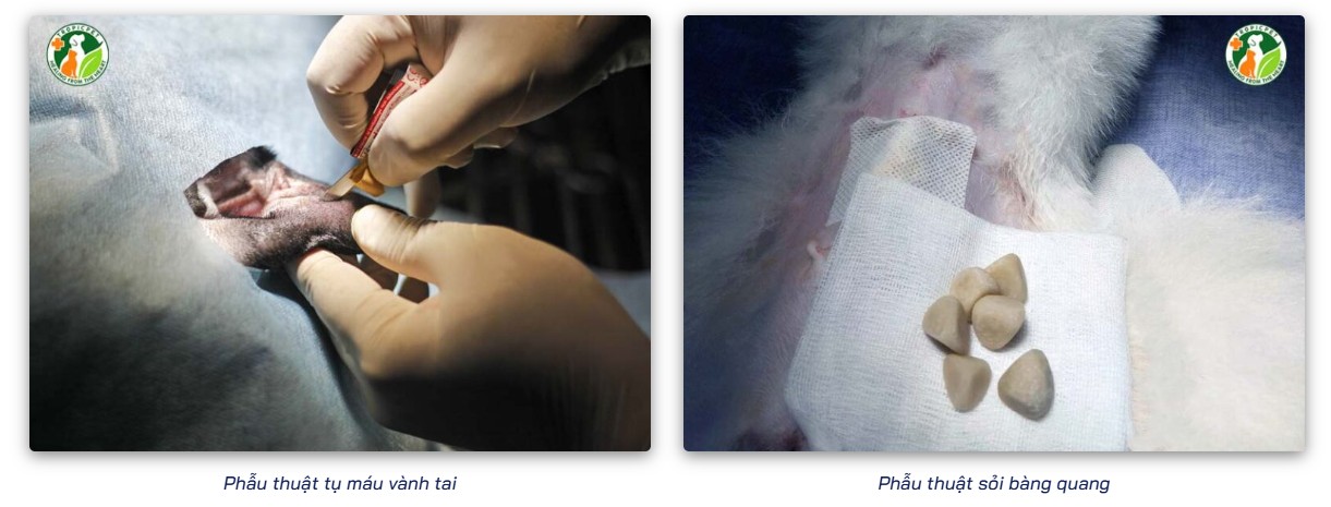 - Phẫu thuật sỏi bàng quang, sỏi thận: Chó mèo khi bị sỏi trong cơ thể cần được xử lý kịp thời để tránh nguy hiểm. Nguyên nhân có thể là do uống ít nước, ăn thức ăn giàu đạm hoặc mặn, nhiễm trùng đường tiết niệu. Phẫu thuật sẽ được thực hiện để loại bỏ sỏi từ thận hoặc bàng quang.