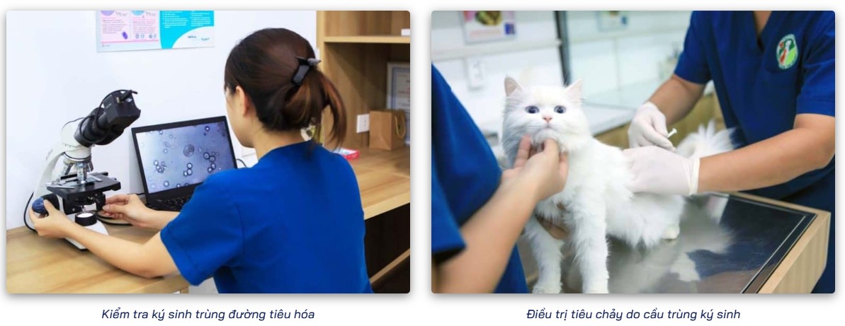 • Chẩn đoán & điều trị: Áp dụng phác đồ điều trị riêng đã được nghiên cứu và thực hiện hiệu quả với từng loại ký sinh trùng, bao gồm thuốc uống, thuốc tiêm, và các biện pháp chăm sóc hỗ trợ khác.
