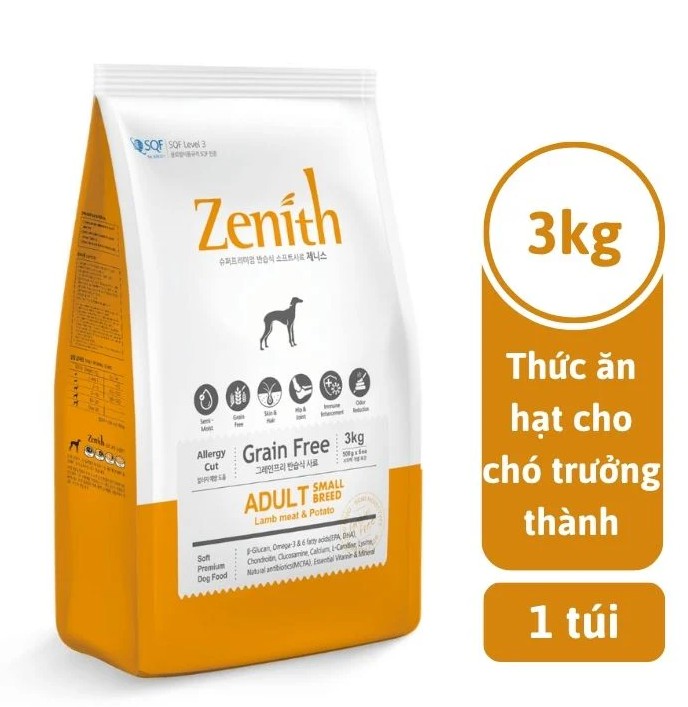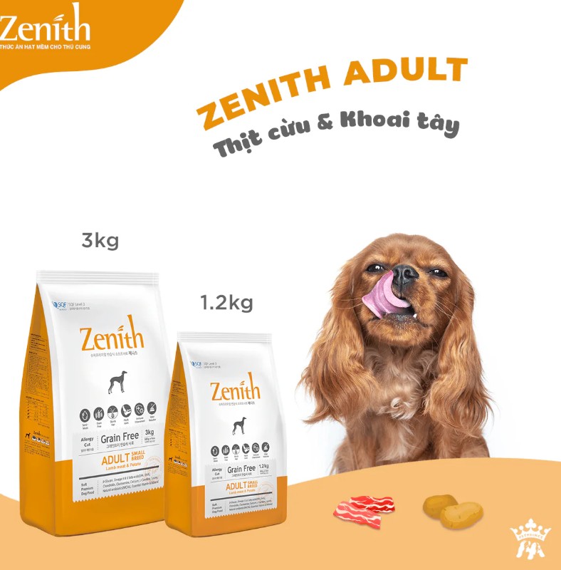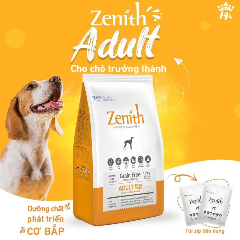 - Thuộc dòng sản phẩm thức ăn hạt mềm cao cấp cho thú cưng. Thức ăn hạt cho chó lớn Zenith Adult được chế biến từ thịt cừu tươi, thịt nạc gà rút xương, gạo lứt, yến mạch và dầu cá hồi. Với các thành phần tươi sạch, giàu dinh dưỡng, hạt mềm Zenith Adult cung cấp độ ẩm cao và lượng muối thấp, thơm ngon, dễ nhai, dễ tiêu hóa và tốt cho sức khỏe chó trưởng thành.